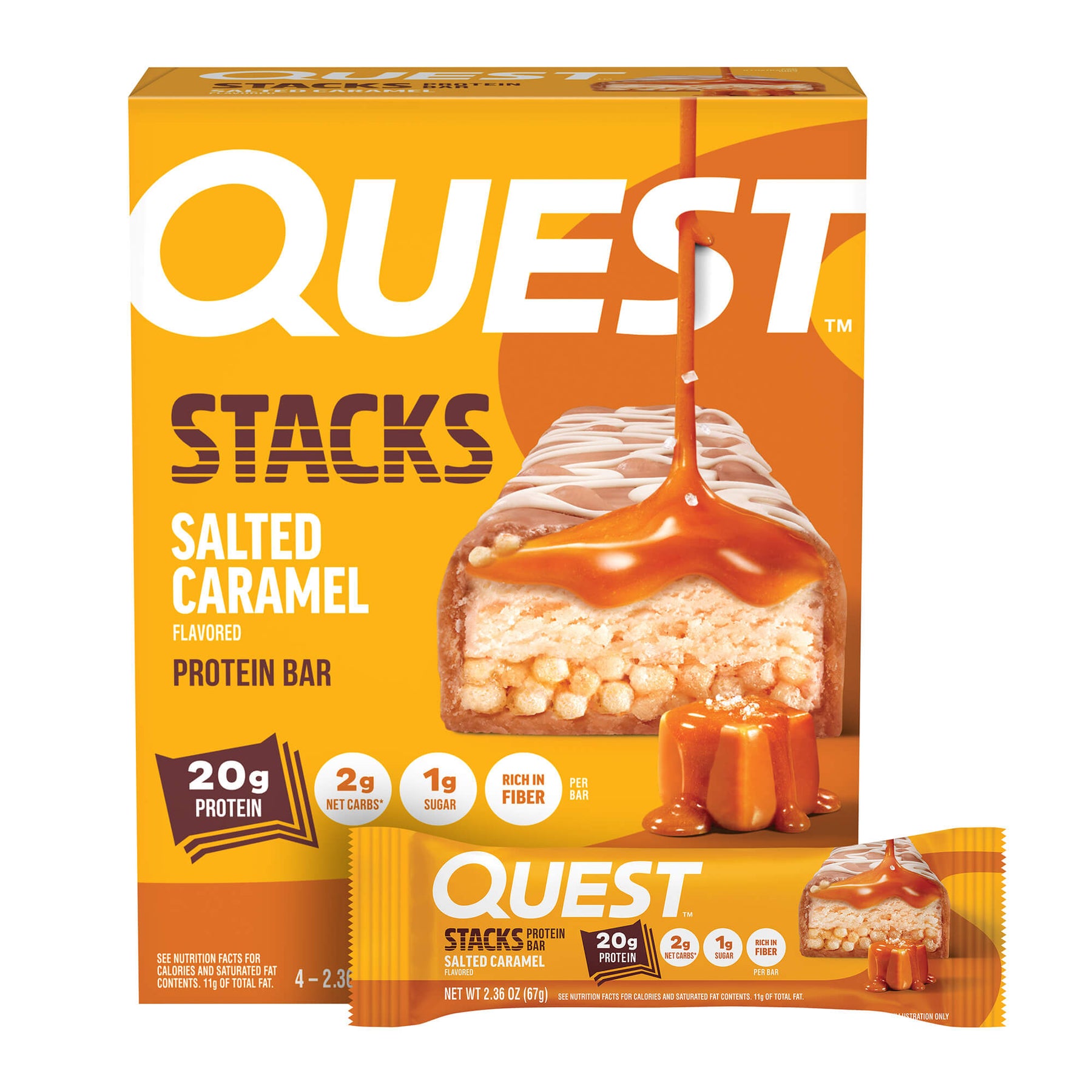 Succumb to stacks of tasty protein. New Quest™ Stacks Protein Bars are stacked with even more of the deliciously sweet layers you love—without a ton of sugar. Our New Salted Caramel Flavor features an irresistible combo of crispy, crunchy, and chewy layers—along with soft dough, a caramel-y ribbon, and a caramel flavored coating and drizzle. Rich in fiber with 20g of protein, 2g of net carbs and 1g of sugar* it’s the high protein bar that’s made to dazzle your taste buds and support your nutritional goals. Keep a few in your gym bag, desk drawer, or pantry for any moment when you need a tasty protein boost. Stock up on these gluten free bars and all your other Quest favorites, from cookies and chips - to shakes, muffins, and more. Surrender to satisfaction and set your taste buds free. It’s basically cheating.