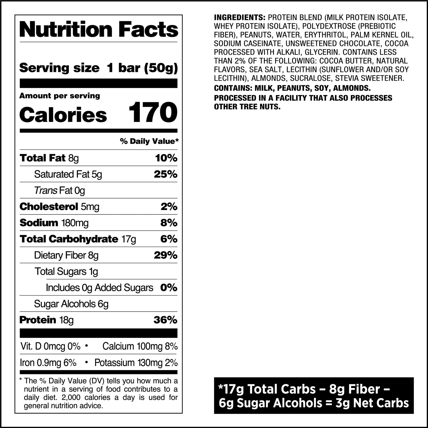 INGREDIENTS: PROTEIN BLEND (MILK PROTEIN ISOLATE, WHEY PROTEIN ISOLATE), POLYDEXTROSE (PREBIOTIC FIBER), PEANUTS, WATER, ERYTHRITOL, PALM KERNEL OIL, SODIUM CASEINATE, UNSWEETENED CHOCOLATE, COCOA PROCESSED WITH ALKALI, GLYCERIN. CONTAINS LESS THAN 2% OF THE FOLLOWING: COCOA BUTTER, NATURAL FLAVORS, SEA SALT, LECITHIN (SUNFLOWER AND/OR SOY LECITHIN), ALMONDS, SUCRALOSE, STEVIA SWEETENER.